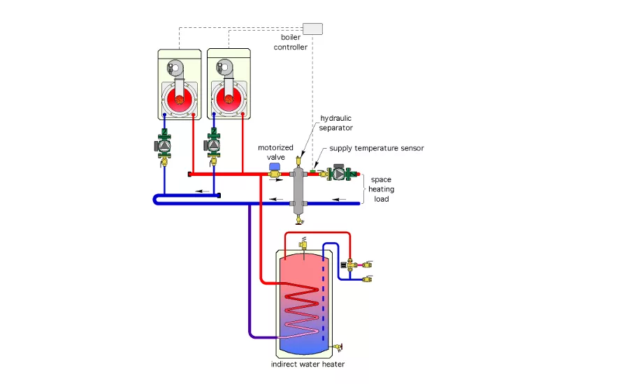 Glitch drawing: To connect an indirect water heater to a multiple boiler system, the designer selects a hydraulic separator for the project. He connects the piping of the indirect water heater on the same side as the boilers. He also specifies a motorized valve, as shown in the schematic. Graphic credit: John Siegenthaler, P.E.