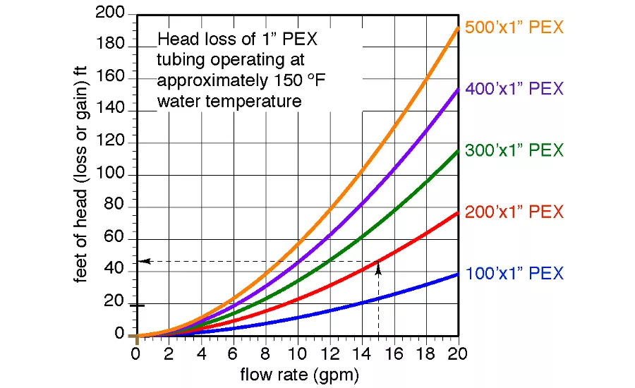 The corresponding head loss of a 200-ft.-long circuit of 1-in. PEX at 15 gpm can be estimated from Fix drawing No. 1 above.