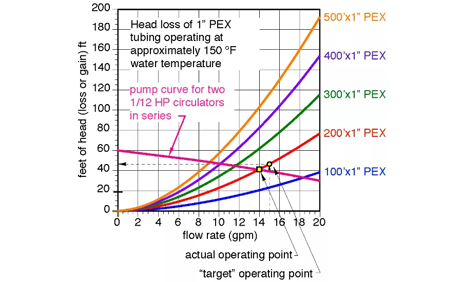 Notice that the intersection of the pump curve and the head loss curve for the 200-ft.-long circuit of 1-in. PEX falls at about 14 gpm (shown by the yellow square). This is where the system would reach hydraulic equilibrium if this particular circulator selection is used.