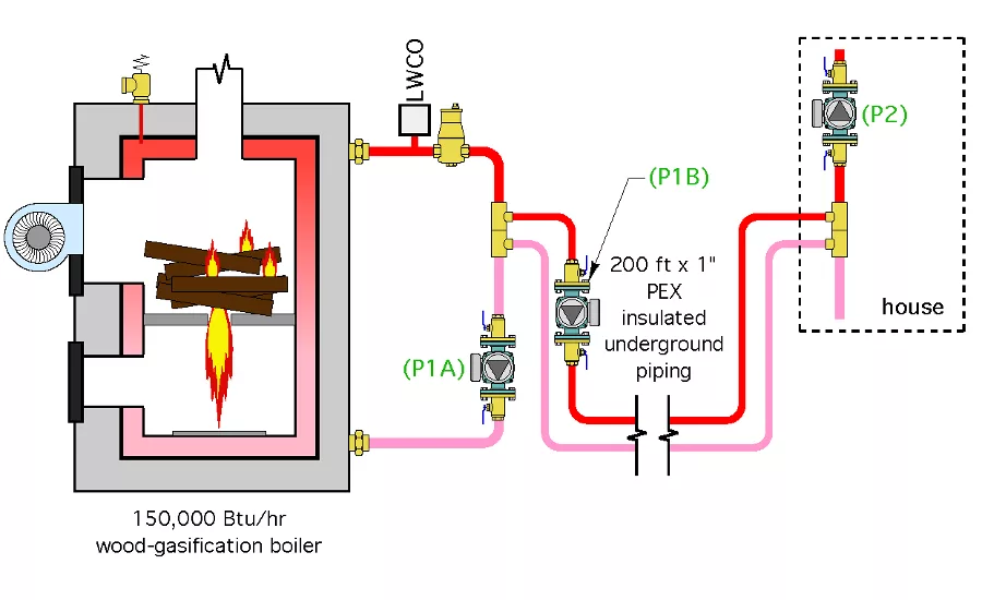 Due to its low efficiency and high emissions, an installer plans to replace an outdoor wood-fired furnace with a new cordwood-gasification boiler with a rated output of 150,000 Btu/hr. The outdoor furnace is located about 100 ft. from the indoor mechanical room where the 1-in. PEX insulated underground piping joins the thermal storage tank. Due to existing landscaping, the installer plans to use the existing underground piping.