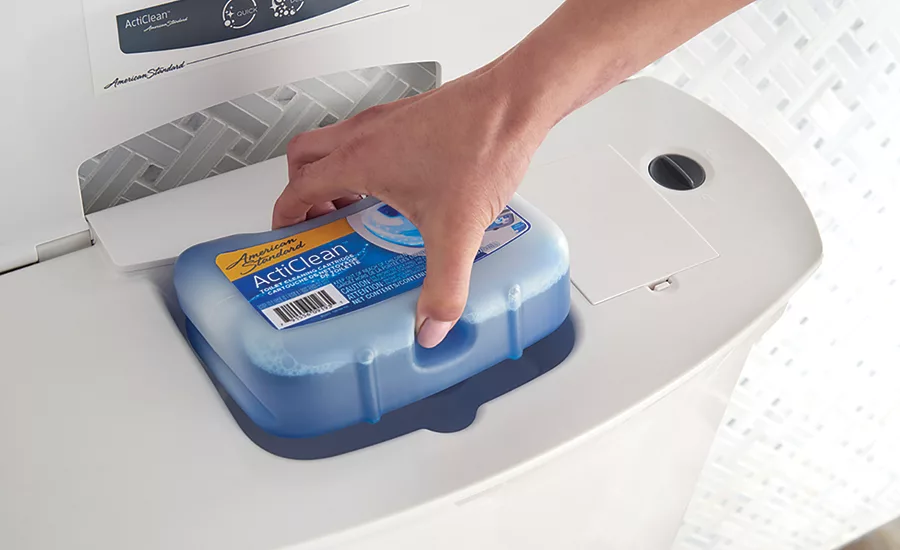 American Standard’s ActiClean system is the toilet that cleans itself, combining VorMax flushing technology with a fully integrated self-cleaning system. The user presses the button for the preferred cleaning cycle: a Quick Clean takes 1 minute, and a Deep Clean offers an extended, 10-minute cleaning cycle. When the soaking time has ended, the system will automatically siphon the cleaning agent and rinse the bowl with clear water. The toilet is capable of successfully removing 1,000 grams (2.2 pounds) of waste using 1.28 gpf.