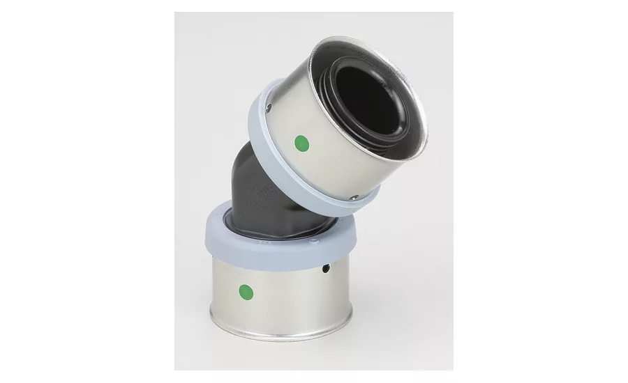 Viega’s 45-degree elbows for PEX Press systems allow users to install larger tubing with press technology. The elbows are available in 1.5-inch and 2-inch sizes. The elbows feature patented Smart Connect, which allows water to flow past an unpressed fitting. Offerings also include PEX Press test plugs, PEX Press 90-degree flare elbows, PEX Press reducing tees, and PEX pipe supports. The system is molded from Radel-R. The fittings are factory-assembled with attached stainless-steel sleeves with three view holes that help installers insert tubing correctly, ensuring proper installation. Color-coded tool locator rings assure proper alignment of the press tool.