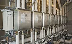 An engineered rack system connects as many as six tankless water-heating units, allowing for total Btu capacity to be split among multiple water heaters. Photo credit: Bruce Damonte