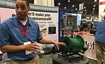 Armstrong Fluid Technologies’ Rohit Mohindra demonstrates the company’s new Design Envelope Tango Pump at the 2017 AHR Expo. Photo credit: Plumbing & Mechanical