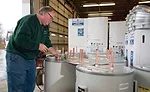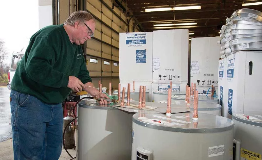 Plumber Pat Sheridan prefers to pre-solder and attach copper stems in a large storage area at White Horse Village for faster water heater installations in resident’s quarters. Photo credit: Bradford White