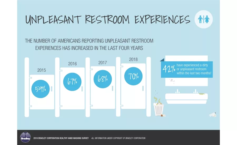 That means more businesses may be on shaky ground with customers since 70% of Americans report having an unpleasant restroom experience — a number that has steadily increased from 59% over the past three years. In fact, 42% said they had a bad experience within just the past two months.