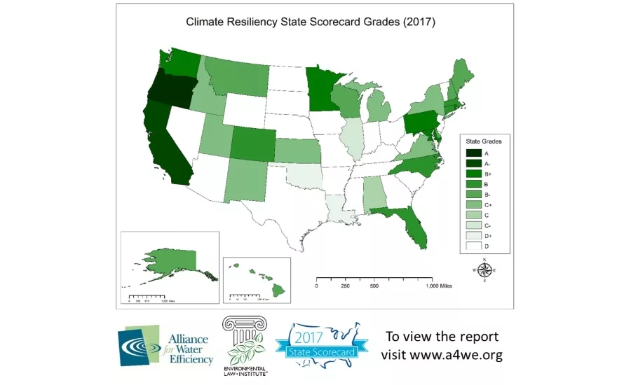 According to a report released today by the Alliance for Water Efficiency (AWE) and the Environmental Law Institute (ELI), most states have a long way to go to shore up their legal frameworks and improve requirements that contribute to water conservation and efficiency, and long-term resiliency. In the 2017 Water Efficiency and Conservation State Scorecard update, each state received two separate grades: one for efficiency and conservation and one for climate resiliency planning. As the number of droughts and water shortages continues to increase nationally, the existence of state-level laws that advance water efficiency and conservation is becoming more critical. The national average for water efficiency and conservation is a “C,” despite progress made by more than half of states since the 2012 State Scorecard.