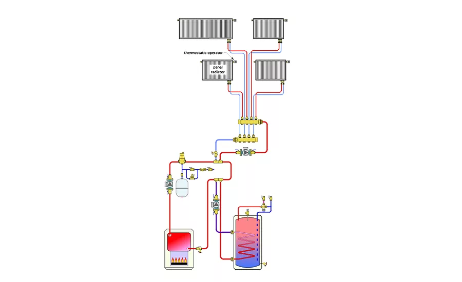 Another change is use of a pressured regulated constant ∆P circulator within the subsystem serving the panel radiators. This eliminates the need of a differential pressure bypass valve and significantly reduces operating cost compared to a fixed speed circulator. Today, it’s likely to be less expensive to install a pressure regulated circulator compared to a fixed speed circulator paired up with a differential pressure bypass valve. The operating cost will also be less than half that of an equivalent fixed speed circulator.