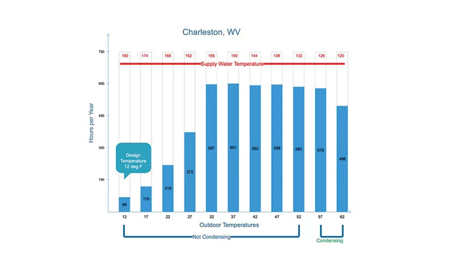 Since 1899, most hydronic systems were designed to provide 180° supply temperature at the outdoor design temperature. The outdoor design temperature is the temperature used by engineers and designers to size a heating system. It is close to the coldest temperatures in a typical heating season in an area. I have enclosed a chart which shows the bin temperatures for Charleston, West Virginia. The graph shows the design temperature for the city is 12°. This means the heating system has to provide 180° water when the outdoor design temperature is at or below 12°.