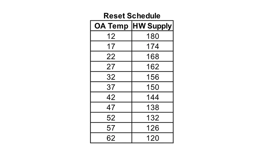 The Reset Control table shows how the supply temperature varies with the changes in the outdoor air temperature. All Graphs Courtesy of Ray Wohlfarth.