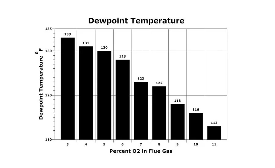 The Dewpoint Temperature chart shows how the flue gas dew point or condensing temperature changes with the amount of air added to the burner. All Graphs Courtesy of Ray Wohlfarth.