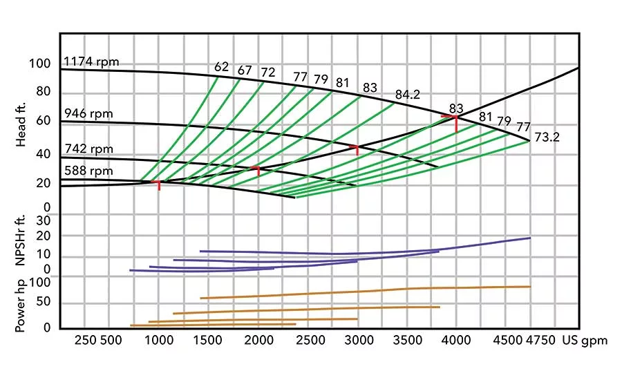 In the first scenario, the full load requirement is 4,000 gpm at 65 feet of head with a control head requirement of 19.5 feet. These design parameters should be carefully considered, as they dictate the system curve driving the selection decisions.