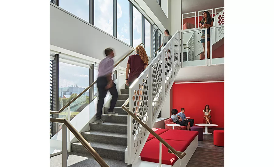 In addition to dorm rooms, some common areas of the residence hall complex, including this multistory space, are heated and cooled with REHAU radiant technology.