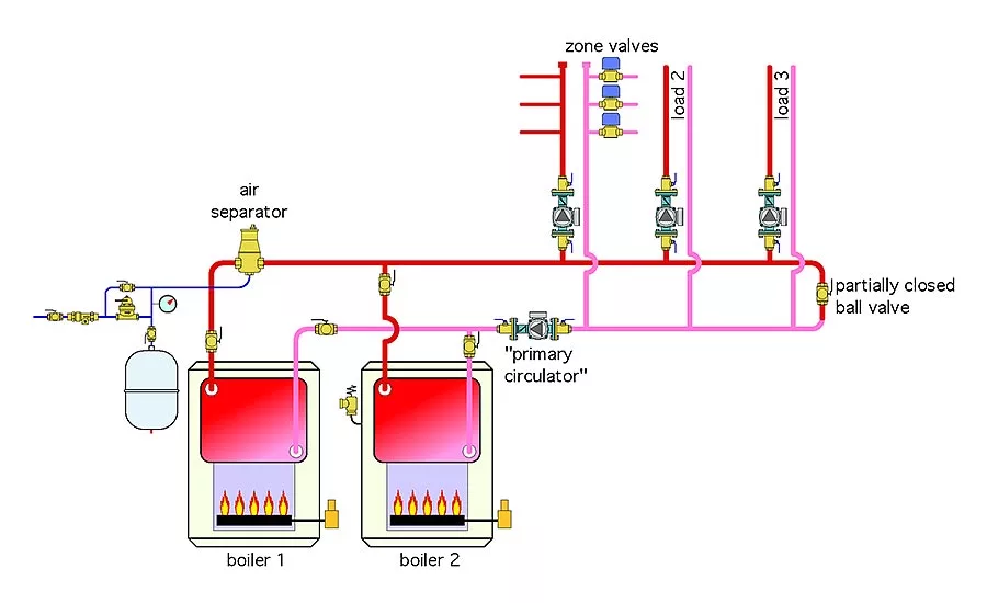 Figure 1 shows the piping layout for an actual installation. It uses two boilers, fired in stages, to supply three areas of a building. One of those areas is sub-divided into three zones. The other two areas are handled by individual zone circulators. The “primary circulator” operates whenever any load circuit is on. All circulators are fixed speed, and there is a partially closed ball valve at the end of the “primary loop.”