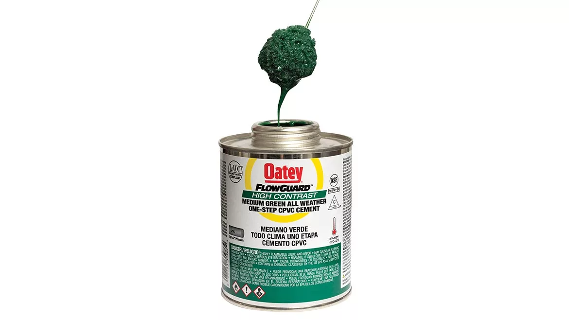 Oatey Co.’s new FlowGuard high-contrast one-step medium green CPVC cement features a vivid coloring designed to make it easier for professional installers to identify a proper solvent-welded CPVC connection. Contrasting sharply with the yellow color of CPVC pipe, the cement’s unique green color helps installers visually identify pipe fittings that have not been solvent- welded, which can cause damaging blowouts during system testing, Oatey explains.
