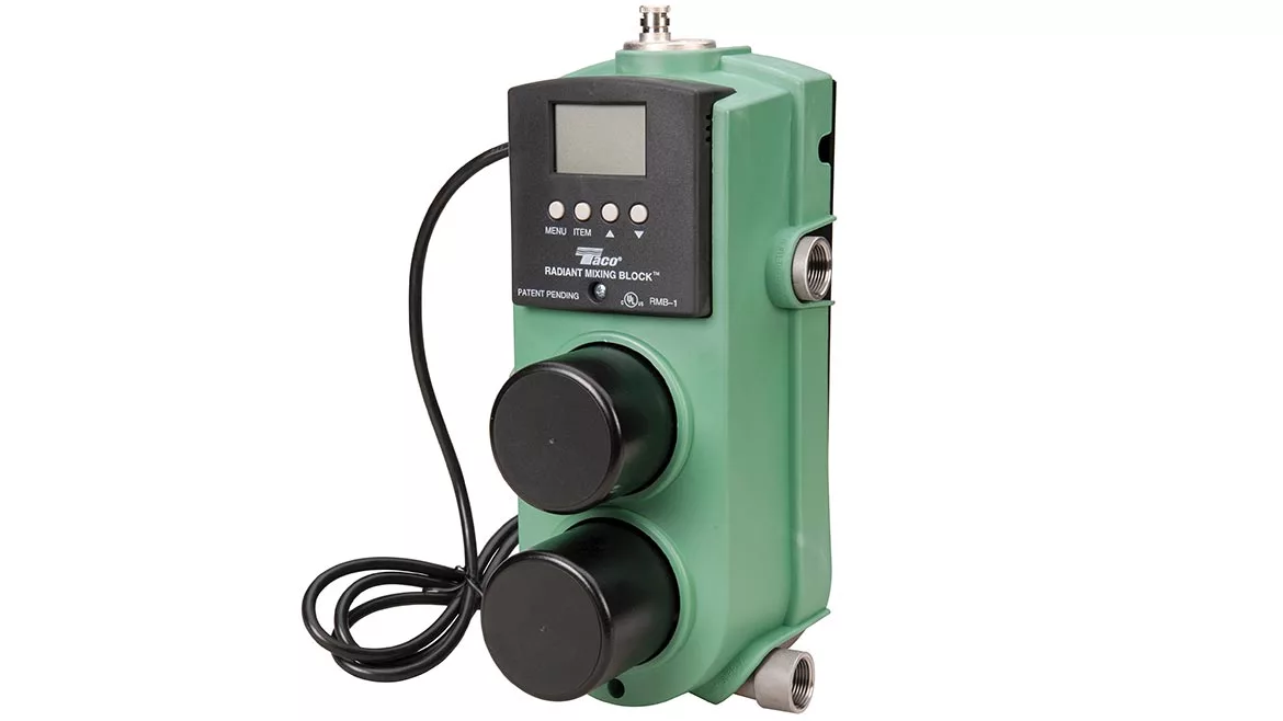 The Taco Radiant Mixing Block is a complete injection mixing system, combining a variable speed injection mixing control, injection circulator, system circulator and air elimination in one unit. Use as an outdoor reset control, setpoint control or Delta-T limiting control. Only four pipe connections needed.