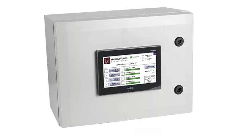 The ZoneBraker touchscreen multi-zone snow melting controller allows for zoned control of a snow melting system, breaking total heating coverage into four separate zones. These zones can then be "turned on" independently, which reduces the total power load. Users can easily set custom operational times for each zone in case an area of the outdoor surface needs to run (ie the bottom of a sloped driveway where accumulated runoff needs a longer runtime).