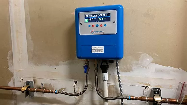 “The device is very simple: Two water lines, one in and one out, drainage and power. Not much to it,” he continues. “All Rich had to do was cut out the backflow preventer and the PRV, hook the water lines to the Mikrofill unit and hang the device on the wall. Fortunately, we had a 120-volt box hanging close by, right where we had planned to mount the device.”
