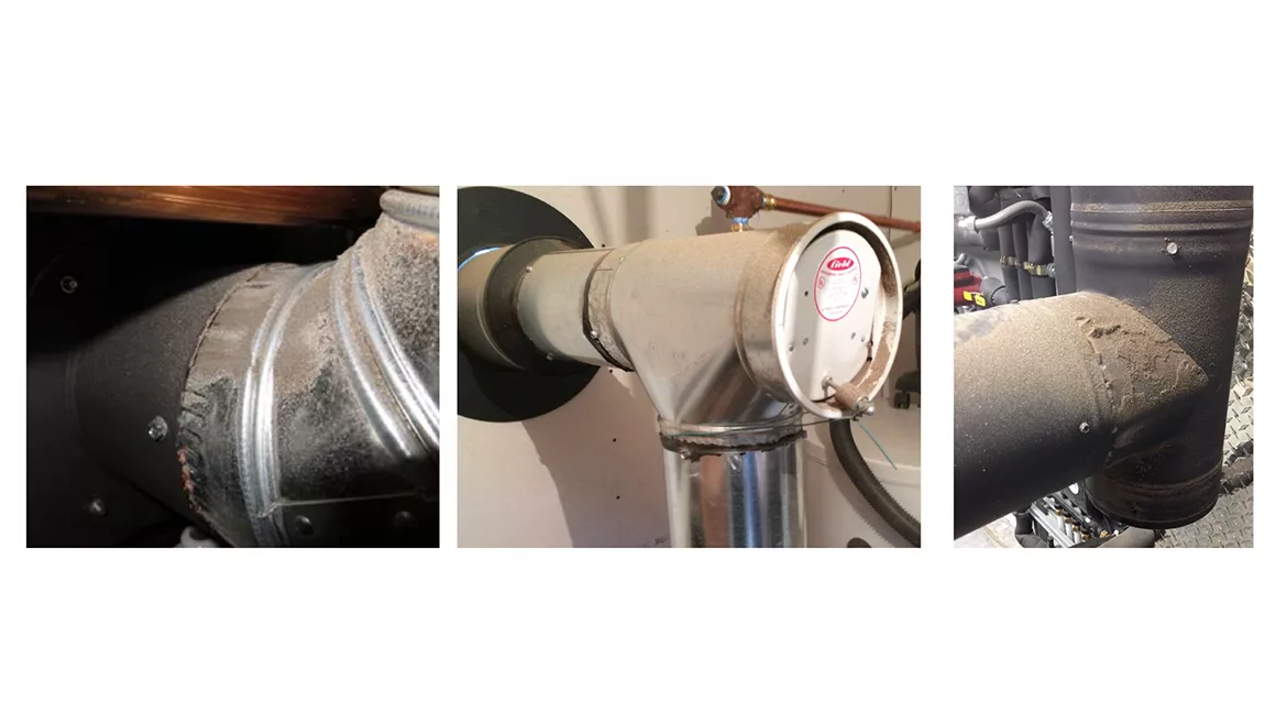 In situations where a modern pellet-fired boiler is combined with a “cold” chimney, the flue gas flow created by the boiler’s inducer blower at startup can be higher than the initial drafting ability of the chimney. The result is slight positive pressure in the vent connector piping. The flue gases and any small amount of fly ash present in the exhaust stream will find any exit point in the vent connector piping assembly. That’s why you see the ash accumulating on the outside of the vent connector joints and draft regulator in Figure 1. This condition is especially problematic with an exterior masonry chimney due to its high thermal mass. Following a cold start on a winter day, that type of chimney can take a while to establish a good draft.