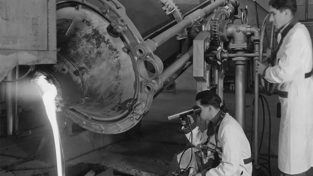 A. O. Smith engineers smelt mixed ingredients into a liquid mass under 2,000 degree (F) heat. This was one step toward glass-lined innovations