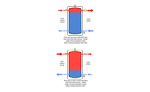 If the flow rate from the heat source is lower than flow to the distribution system, cooler water will migrate upward within the tank. Under this condition the tank is giving up heat to the load. If the flow rate from the heat source is greater than the flow rate to the distribution system, hot water migrates downward within the tank. The average tank temperature increases as the excess output from the heat source is stored. Both conditions are shown in Figure 2.