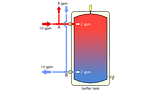 In this “two-pipe” tank scenario, the flow velocity entering the tank is lower than the “four-pipe” arrangement shown in Figures 1 through 3. Lower entering flow velocities help to preserve temperature stratification and thus maintain the warmest water at the top of the tank, ready for transfer to the load.