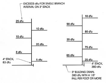 To size a stack, there are three main criteria that must be considered: the discharge into a branch interval, total discharge into a stack and total number of branch intervals. Within any given branch interval, a stack is limited as to the maximum amount of discharge it can receive. A branch interval cannot be less than 8 feet and generally corresponds to a story height (see Figure 4). More than one horizontal branch is permitted to connect in a branch interval provided the total load for all branches is less than the dfu value listed in the two columns of the stack sizing table or the third column of Table 5 (see Figure 5).
