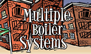 Multiple boiler systems are exceptionally well suited to systems that combine space heating with high but intermittent demands for domestic hot water.Consider a situation where the hot water demand is 15 gallons per minute heated from 50 to 120 degrees F. This works out to a heating rate of 525,000 Btu/hr! A 120-gallon tank filled with 140-degree water can supply this load for about nine minutes. After that, it all comes down to raw boiler power.