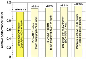 The bar graph in Figure 2 shows projected savings of some common multiple boiler configurations relative to a single on/off boiler sized to match the design heating load.