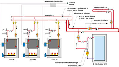 It is crucial to locate the supply temperature sensor for the boiler-staging controller where there is constant flow whenever a load is active. Usually, this is downstream of the closely spaced tees that connect the boiler piping to the system's primary loop, as shown in Figure 4.