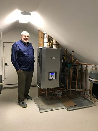 This was Hayden’s motivation to take his company into Class A contracting. The new work included innovative installations of shower sprays in a shower made of glass block, a radiantly heated ledge stone wall, wall mounted toilet, heated towel bar using recirculated domestic hot water for year-round use and radiant heating for hardwood and carpet. Eventually, work on Manion projects has seen the replacement of equipment that Hayden's company installed back in 2008 with new inverter chillers and the latest condensing boilers. The joke was all the projects revolved around a good shower. Another notable Manion project was the modification of a metal spiral staircase in a glass tower to perform like a giant radiator. These installations are all “really cool.”