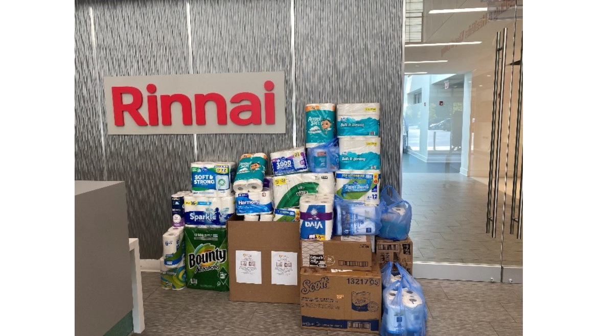 Rinnai America is partnering with the Midwest Food Bank on the assembly of 2,080 family food boxes and collection of 2,080 rolls of toilet paper and 2,080 rolls of paper towels. Image courtesy of Rinnai America