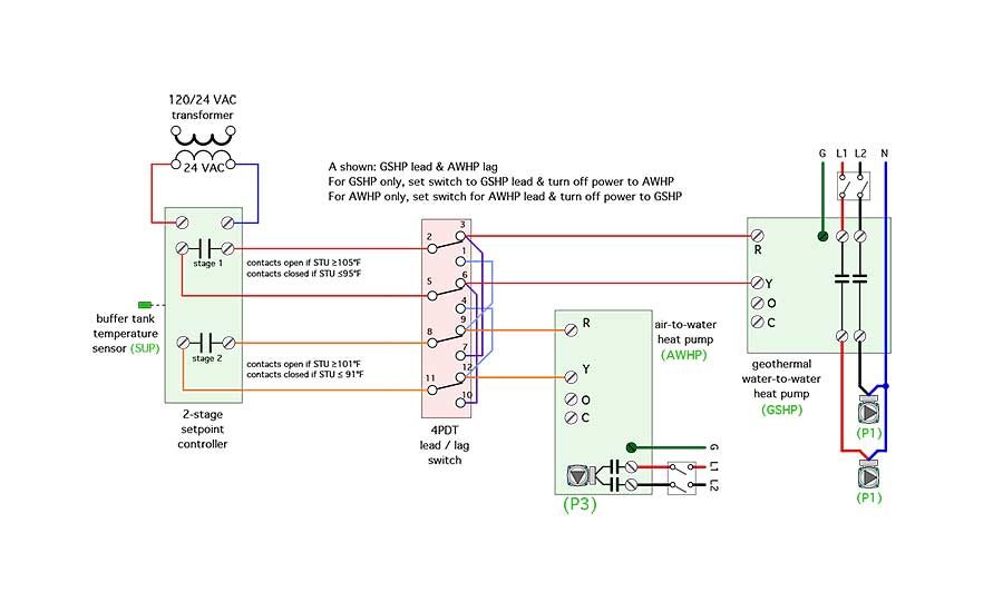 This switch, or an equivalent 4PDT relay, allows the low-voltage control circuit from each heat pump to be matched with the appropriate stage 1 or stage 2 contacts in the setpoint controller. Both electrical circuits are fully isolated from each other, and both are isolated from the 24-VAC transformer powering the setpoint controller. The “R” terminal in each heat pump represents one side of a 24-VAC circuit. The “Y” terminal in each heat pump is the terminal that must receive 24 VAC to turn the heat pump and its associated circulator on in heating mode. Be aware that some heat pumps may use different designations for these terminals.