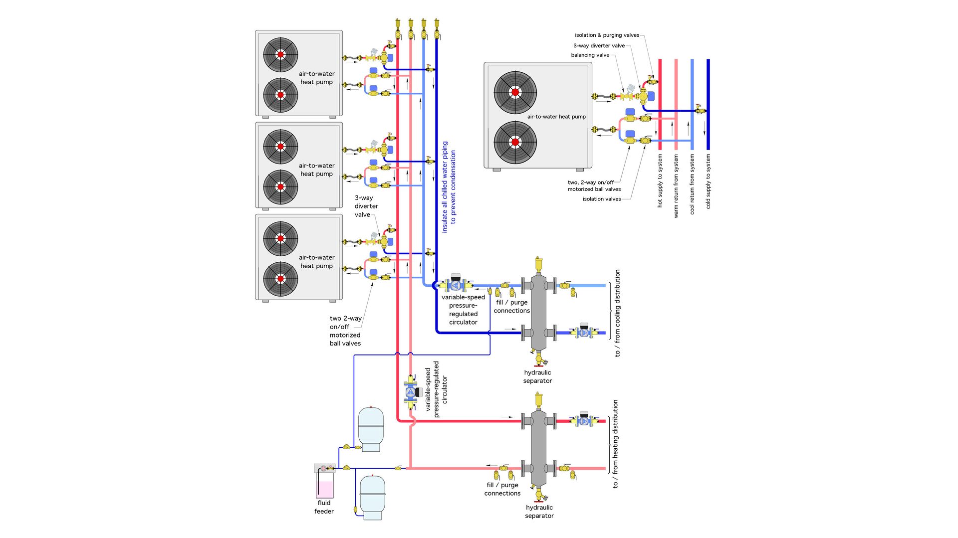 This is another application where a 3-way diverter valve combined with two on/off motorized valves can be used to connect the heat pump to the appropriate supply and return headers and prevent flow through the heat pump when it’s off. Figure 5 shows an example using 3 independently controlled air-to-water heat pumps.