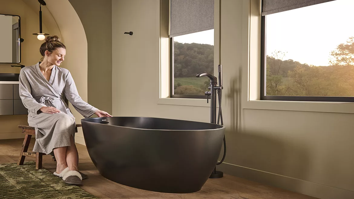Ruvati has introduced a new Satin Black shade option in its Canali bathtub and sink collection. The collection is crafted by artisans in Italy and comes from Ruvati’s signature epiStone, described as a blend of 70% organic crushed stone and minerals with a proprietary resin to create a durable solid surface. The Canali Bath in Black Satin is offered in two sizes: a large 66-1/2" x 31-1/3" x 19-1/2" deep and a more compact model measuring 59" long, both with an oval, double-ended design offering the option of bathing on either side of the tub. The Canali vessel sink measures 19" (wide) x 15" (front-to-back) with a 4" depth.