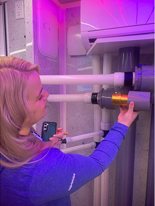 Spectacular, spectacular: Showmanship is at the forefront of most booths exhibiting at AHR that become more ISH-like (ISH trade show in Frankfurt, Germany) every year. Eye candy from this contractor’s perspective. A great draw, to be sure, but it’s the folks populating the booths who make or break the relationship. For example, did you know that installing a threaded adapter in a PVC schedule 80 fitting compromises its pressure rating by 50%? Neither did I until Stephanie Radel (pictured below), senior manager of global water at Uponor provided that heretofore unknown educational tidbit, along with presenting the solvent-weld to ProPress adapter that eliminates that problem during a tour (more to come later) of the Uponor soon-to-be mobile roadshow exhibit – a booth within a booth chockablock full of top shelf information.