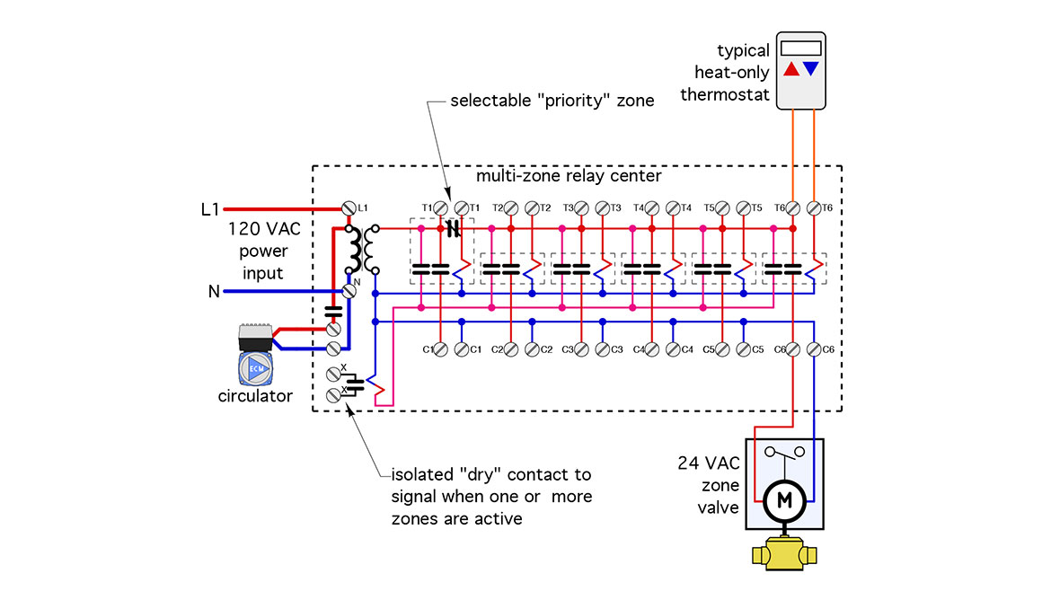 One of the common approaches for wiring multi-zone hydronic heating systems is to use a multi-zone relay center. Figure 2 shows a “generic” and simplified wiring for such a controller.
