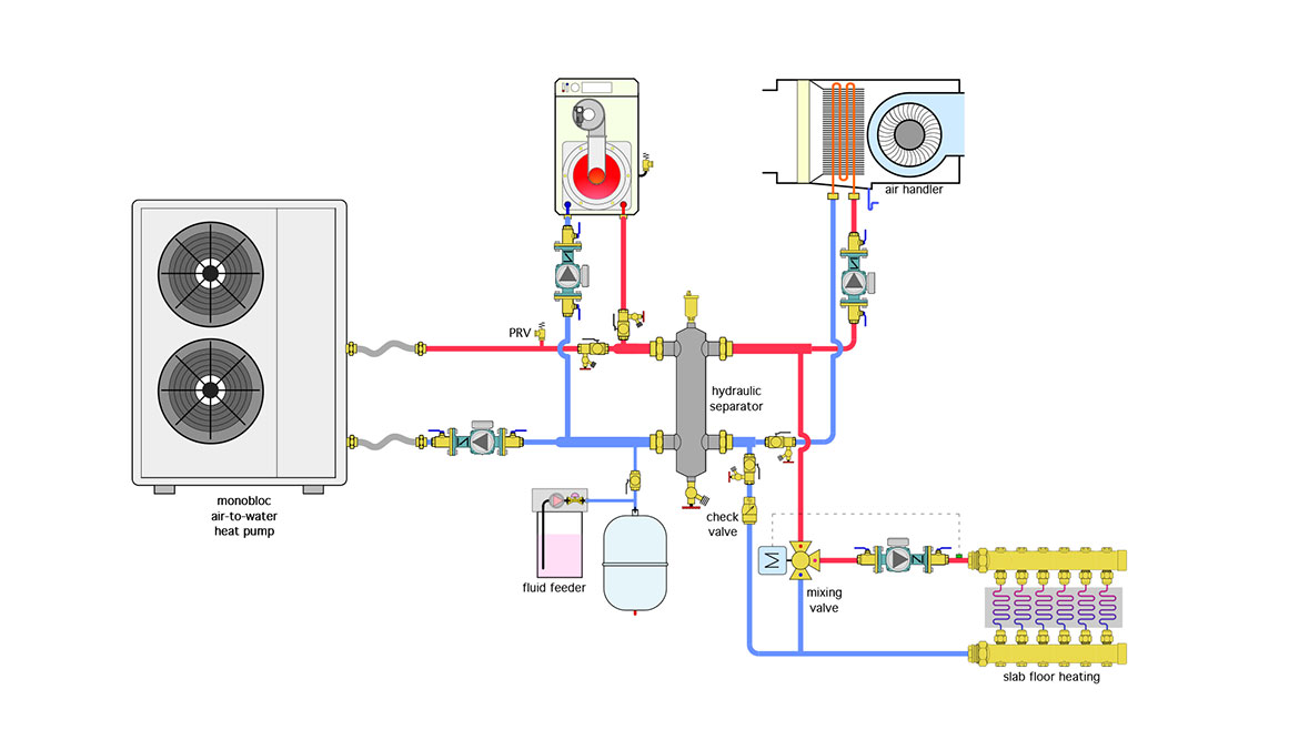 When only the air handler is operating the heat pump is able to supply the 120 ºF water. Whenever the heated slab is operating by itself the heat pump has no problem providing the required water temperature. However, when the floor heating zone and the air handler are operating at the same time and the outdoor air temperature is below 24 ºF the fluid temperature leaving the heat pump can’t climb above 103 ºF. Why is this happening, and what can be done to either prevent it on a new install, or correct it on an existing system? What other hardware details are missing in figure 1?