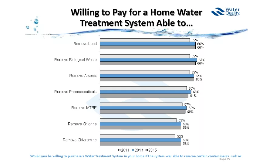 More than half of survey respondents say their main area of concern about their drinking water supply is waterborne contaminants. They would be willing to buy a home water treatment system if it could remove contaminants such as lead, arsenic, chlorine and pharmaceuticals. Photo credit: Water Quality Association. WQA does not sanction the interpretations or conclusions resulting from ongoing analysis of study data.