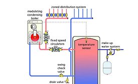An installer needs to provide heat from a conventional gas-fired boiler to a large buffer tank. The tank is necessary because of a highly zoned distribution system.