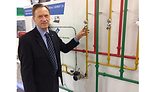 Rex Gillespie shows Caleffi’s new THERMOSETTER, an adjustable valve to automatically balance recirculation loops in domestic hot water systems March 15 at ISH 2017 in Frankfurt, Germany. Photo by: Bob Miodonski/BNP Media Plumbing Group