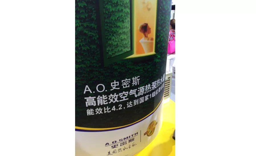 A. O. Smith's signage blends English and Chinese characters in its booth at ISH China/CIHE in Beijing. Photo by Bob Miodonski/Plumbing & Mechanical