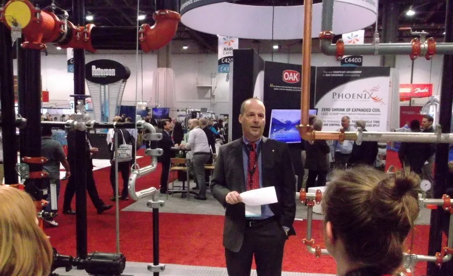 Rick Bucher, Victaulic’s evp of technology and product development, gives the eager trade press a rundown of the company’s new products and initiatives.