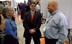 BNP Plumbing Group publisher Bob Miodonski, center, chats with Ann Woodard and Brian Fenske about Navien and its place in the water heater market.