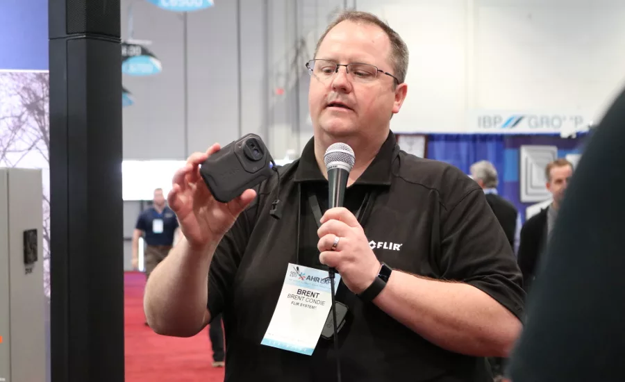 Brent Condie from FLIR Systems shows off one of the company’s latest infrared viewing devices and explains its benefits to contractors.