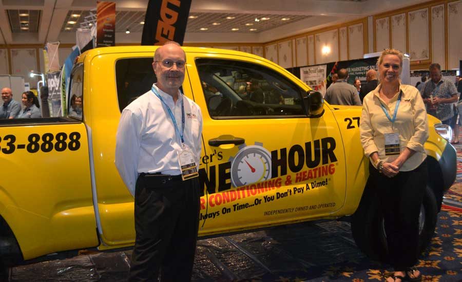 Don Lawrence and Tammie Kennedy of Clockwork, parent company of Benjamin Franklin Plumbing, One Hour Heating & Air Conditioning and Mister Sparky Electric, smile for the camera at Service World Expo.