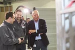 Hilti Group Chairmain Michael Hilti (right) laughs with Hilti employees as they watch guests get hands-on demonstrations with Nuron platform tools.