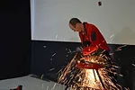 Walls & Ceilings Associate Editor Hannah Belloli tries out the Nuron angle grinder.