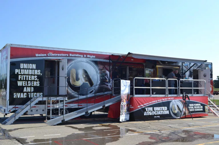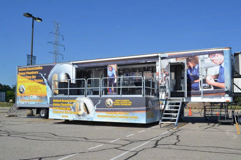 A look at one of many United Association of Journeyman and Apprentices of the Plumbing and Pipe Fitting Industry of the United States (UA) trailers set up at the 68th annual Instructor Training Program at Washtenaw Community College (WCC) in Ann Arbor, Michigan.